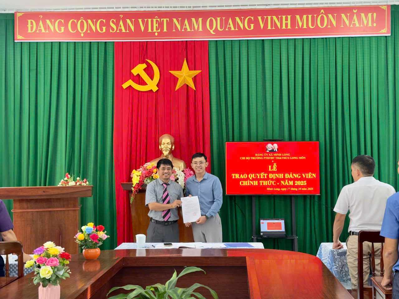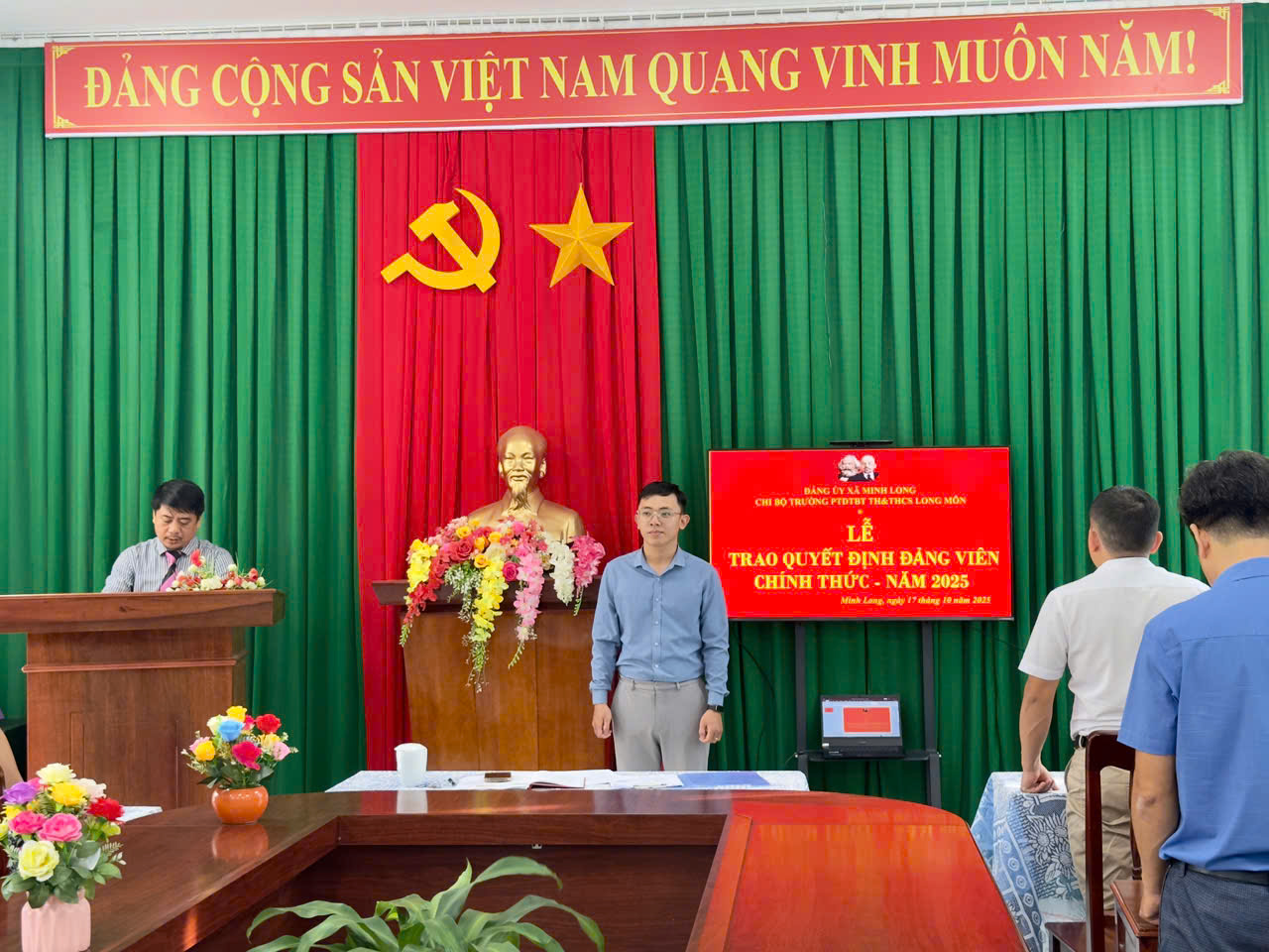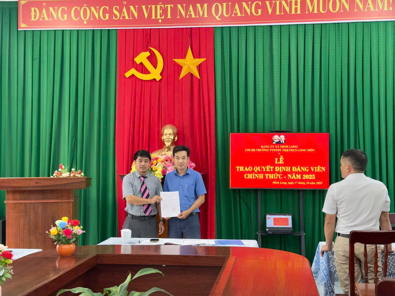 Chiều ngày 17/10/2025, Chi bộ Trường PTDTBT TH&THCS Long Môn long trọng tổ chức Lễ kết nạp Đảng viên chính thức cho 02 đồng chí Lương Hữu Hoàng và đồng chí Đàm Văn Thịnh.