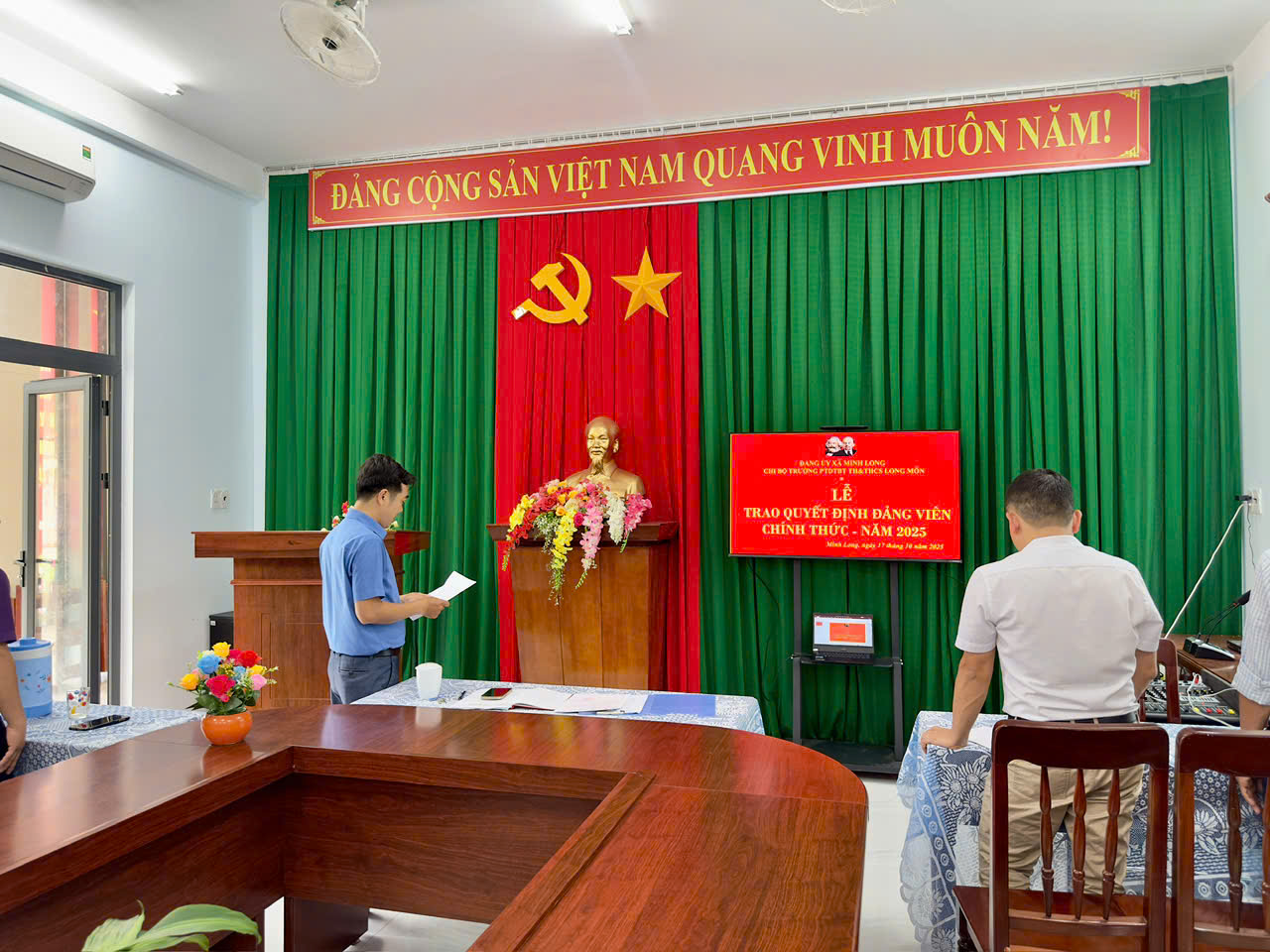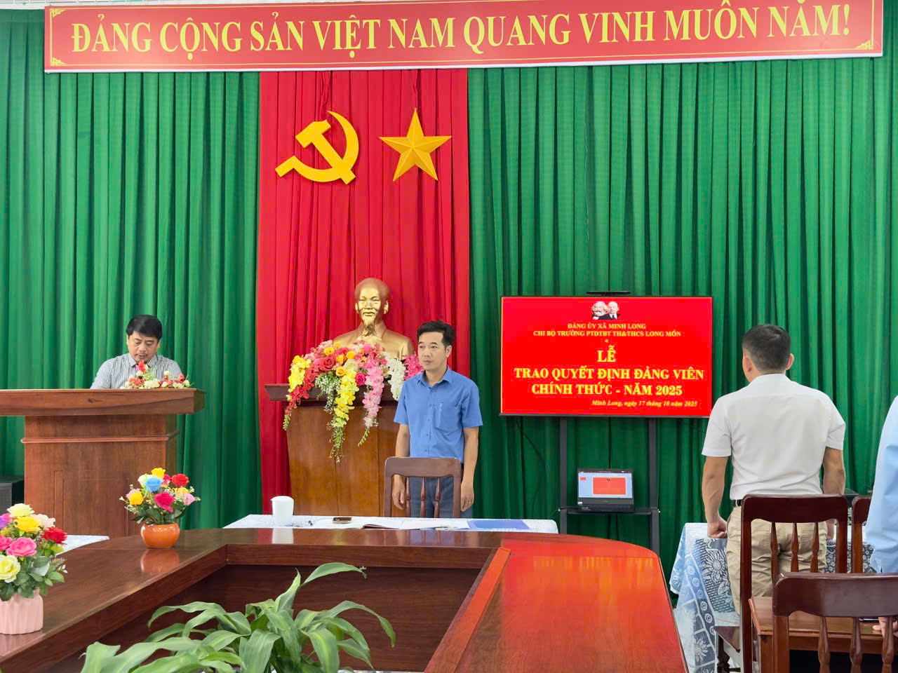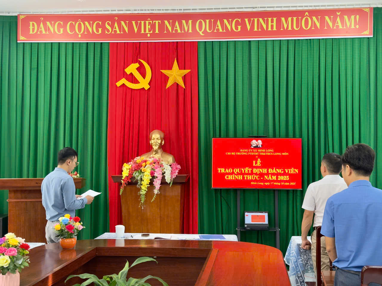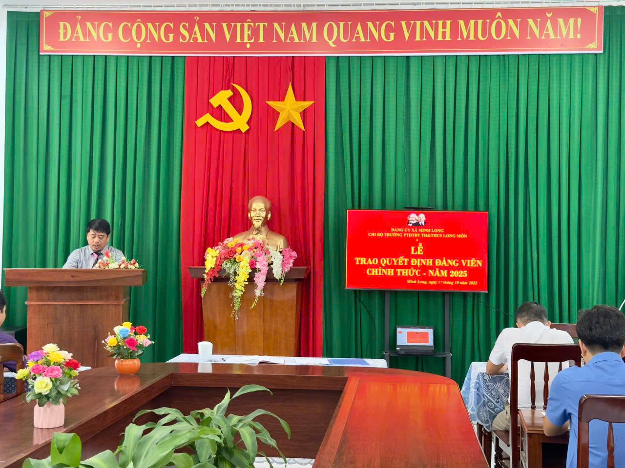 Chiều ngày 17/10/2025, Chi bộ Trường PTDTBT TH&THCS Long Môn long trọng tổ chức Lễ kết nạp Đảng viên chính thức cho 02 đồng chí Lương Hữu Hoàng và đồng chí Đàm Văn Thịnh.